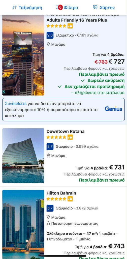 Το καλύτερο; Η εμπειρία αυτή κοστίζει σχεδόν στη μισή τιμή σε σχέση με αντίστοιχα ξενοδοχεία στο Ντουμπάι, κάνοντας το Μπαχρέιν έναν προορισμό πολυτελούς ταξιδιού χωρίς υπερβολικό budget. Είτε ψάχνεις για resort στην παραλία, είτε για city hotel με θέα στο skyline της Μανάμα, θα βρεις επιλογές που συνδυάζουν άνεση, στυλ και εξαιρετική σχέση ποιότητας-τιμής.
